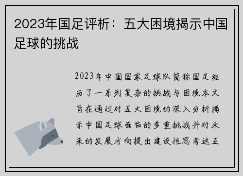 2023年,中国国家足球队(简称国足)经历了一系列复杂的挑战与困境。本文旨在通过对五大困境的深入分析,揭示中国足球面临的多重挑战,并对未来的发展方向提出建设性思考。这五大困境包括:人才培养的瓶颈、教练团队的管理问题、国内联赛的竞争力不足、球员心态的差距以及缺乏系统性的足球文化建设。每一项困境都深刻影响着国足的整体水平,决定着未来中国足球是否能够实现腾飞。通过对这些困境的详细阐述,本文将进一步探讨如何应对挑战、破解瓶颈,并为中国足球的未来发展提供一些可行的建议。