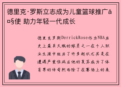 德里克·罗斯(Derrick Rose)作为NBA历史上最具天赋的球员之一,在个人职业生涯中经历了许多起伏,尤其是在遭遇严重伤病后,他的复苏成为了体育界的传奇。然而,除了在赛场上的表现,德里克·罗斯近年来将自己更深的关注点转向了儿童篮球的推广,并立志成为一名儿童篮球推广大使,帮助年轻一代成长。这一使命不仅仅是为了推广篮球,更是为了通过运动,培养孩子们的团队精神、领导力和坚持不懈的态度。在这篇文章中,我们将从四个方面详细阐述德里克·罗斯如何通过篮球影响年轻人:他对儿童篮球发展的关注、他在社会责任中的积极参与、他如何以个人经历为孩子们树立榜样,以及他通过项目和活动推广篮球的具体举措。通过这些方面的分析,展现出罗斯如何从一名篮球明星转型为儿童篮球的推广大使,致力于培养更多有志向、积极向上的年轻人。